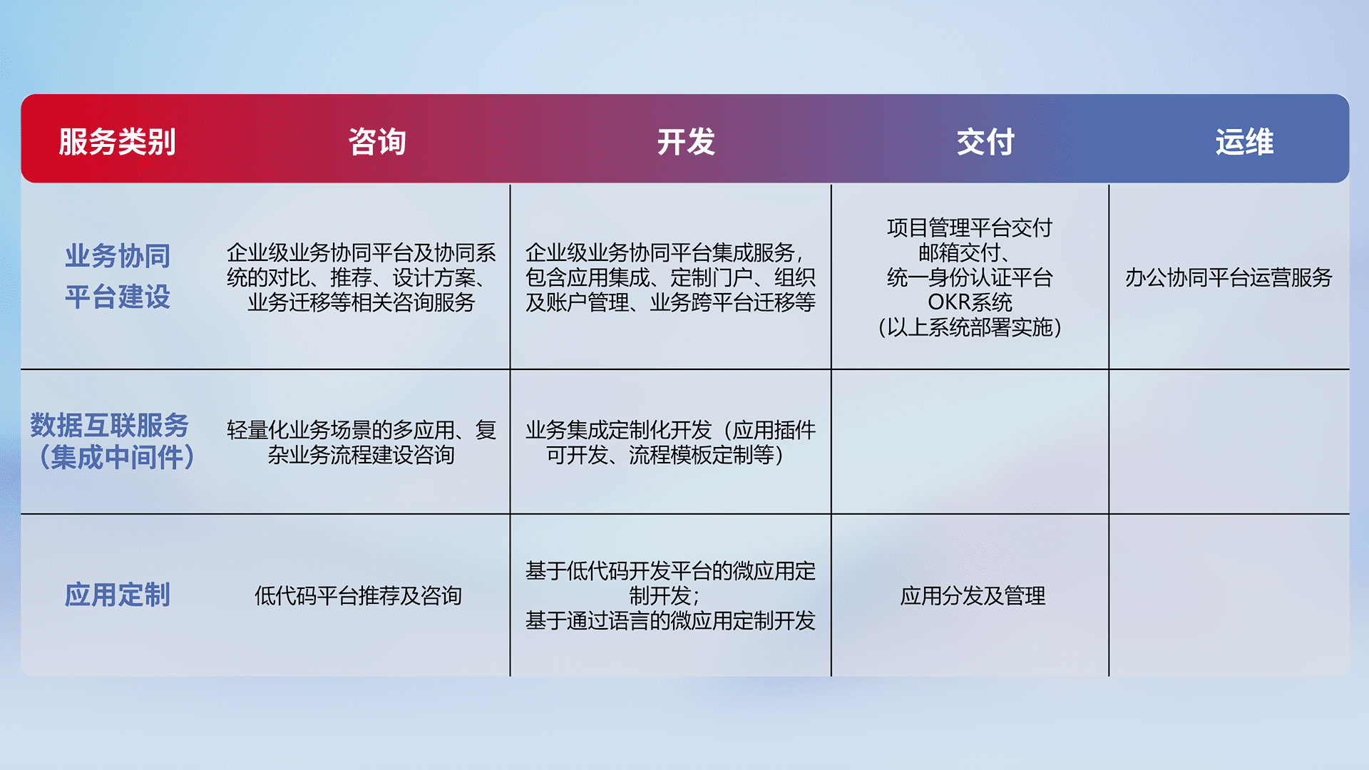 针对钉钉、、企微、、、、IDaas等平台级产品提供产品的规划、、、方案、、交付、、、定制化开发等服务,,,,实现如统一协同办公、、、、智能客户服务、、混合会议管理、、、智能数据查询、、、、等业务场景,,,,实现数字化转型。。。。