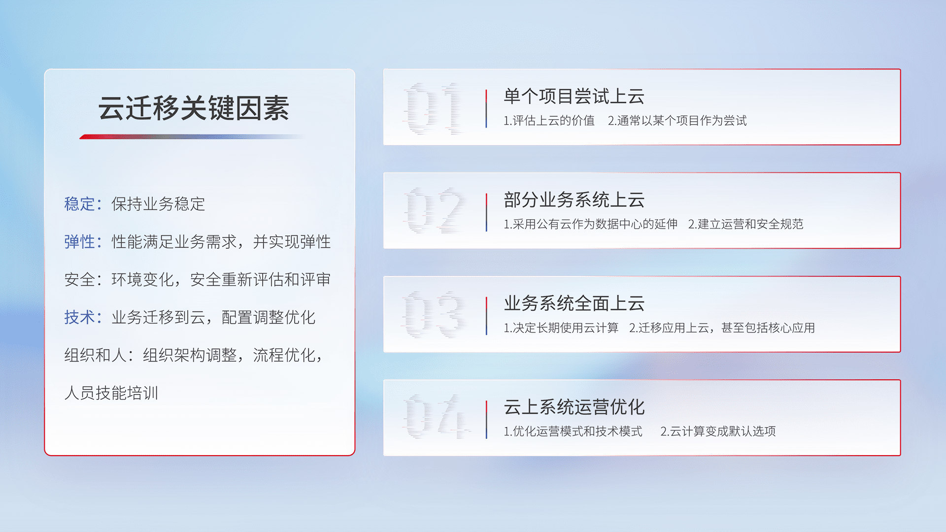 结合实际业务,,从规划设计、、、云平台选型、、、云原生改造、、、、数据迁移、、、、集成交付,,迁移全过程为客户识别最佳上云路径,,,,做好风险识别管理,,,设计网络架构、、身份权限、、、安全审计合规、、操作审计、、、、日志审计、、、监控告警策略、、多站点容灾设计等,,,对云上基础设施进行整体规划,,,提升IT治理水平,,以满足弹性、、、、高可用、、、高性能的需求。。。